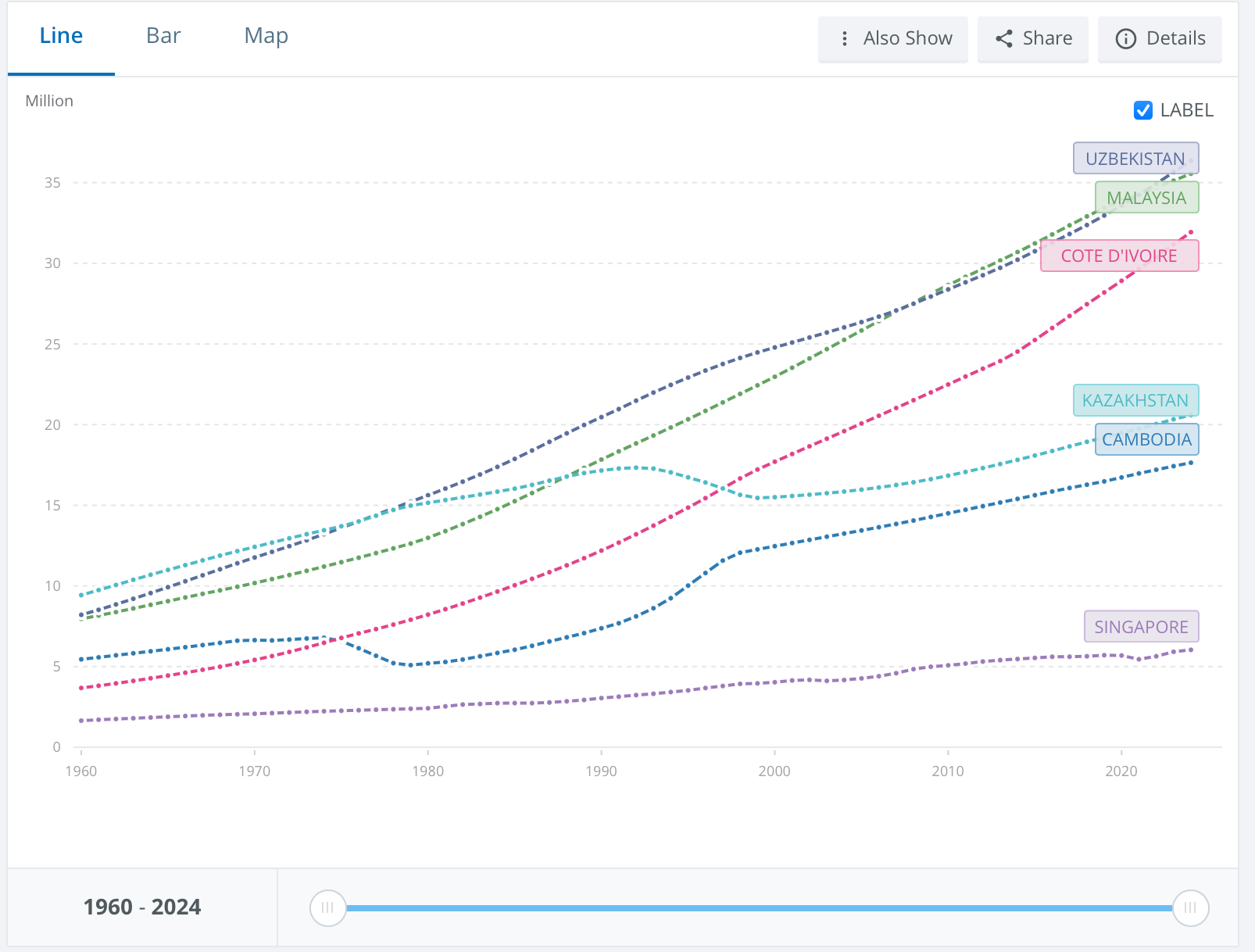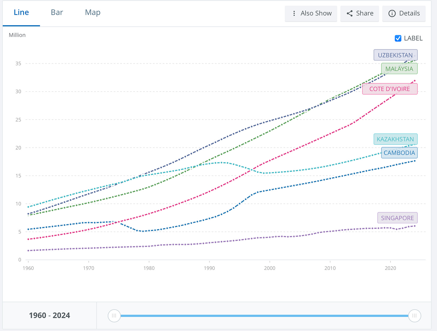 Population-wise Malaysia has 35 million people, and the population is growing, despite a fertility rate of only 1.6 children per woman. That’s because Malaysia had much higher birth rates 20–30 years ago (when it was a proper frontier market), so there is currently a very large cohort of people in childbearing age. Eventually the native population will stop growing, but that point is still far away, and Malaysia has net immigration so the total population might increase while the native population stagnates (like in neighboring Singapore).