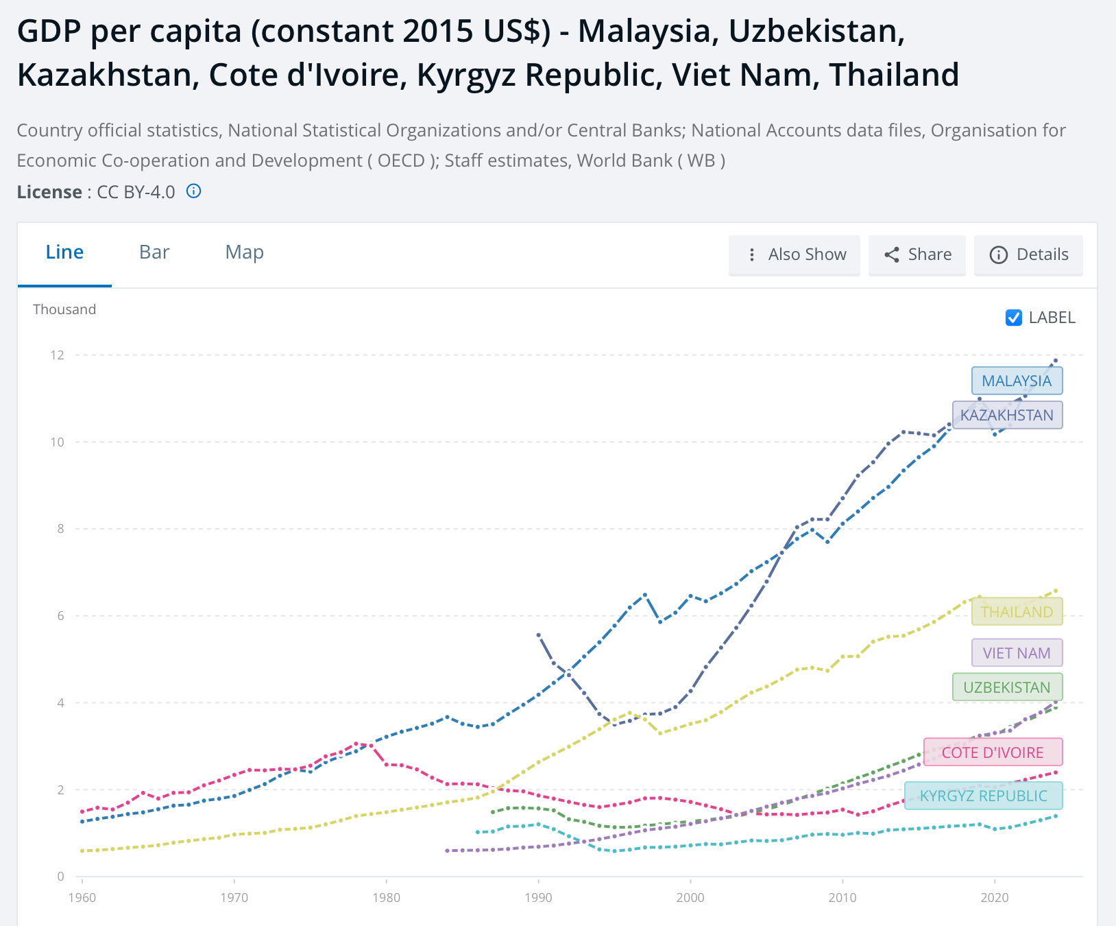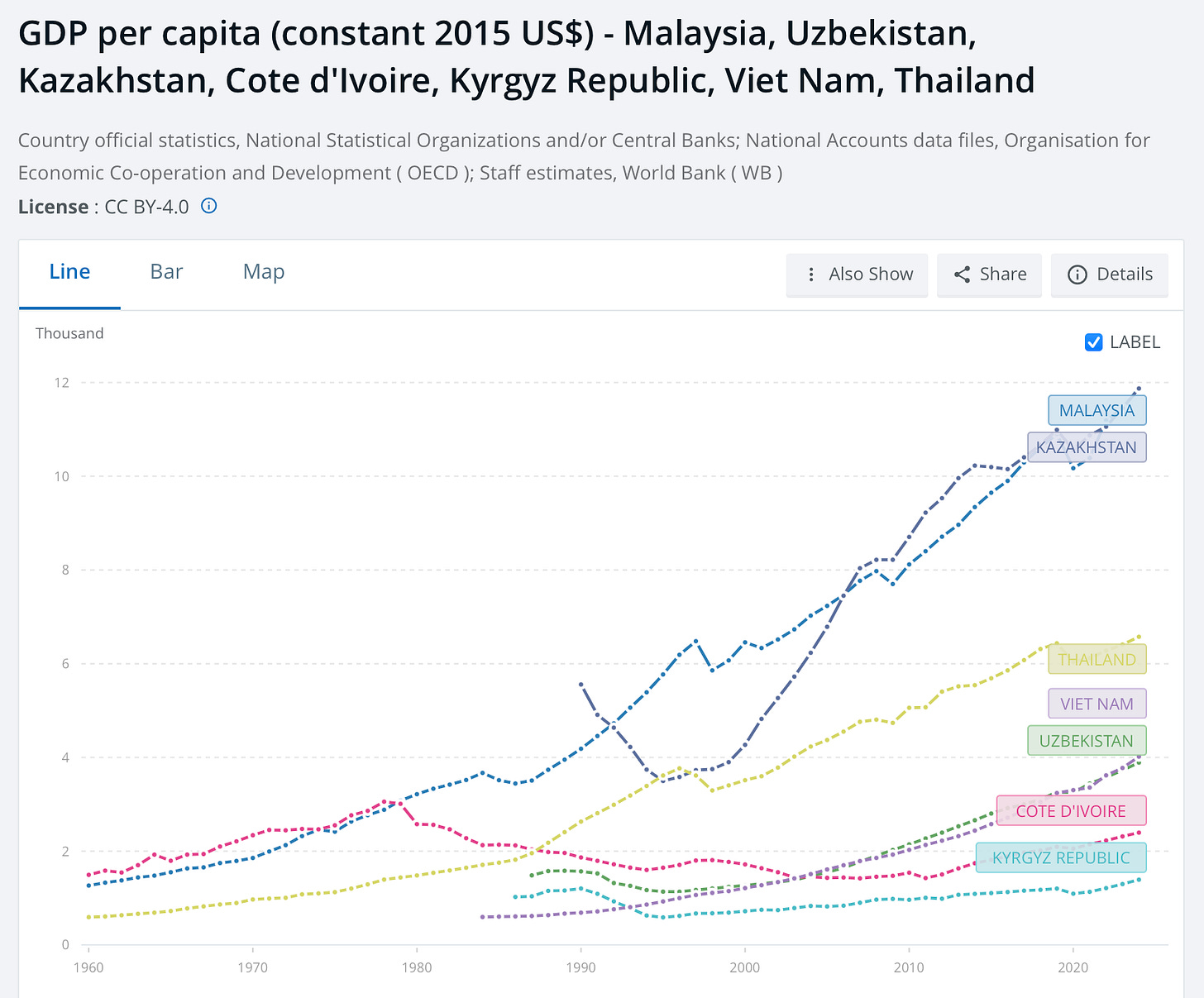 Compared to the other countries I’ve written about, Malaysia is a step up in prosperity - on level with Kazakhstan - but growing faster than Thailand (in yellow below), and almost as fast as Vietnam/Uzbekistan.